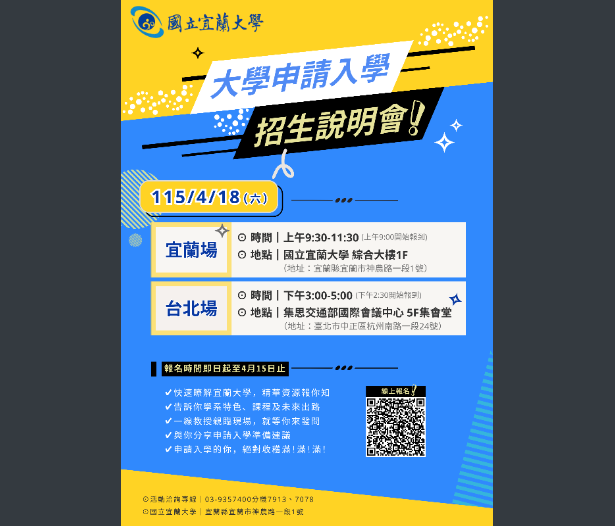 宜蘭大學「115學年度大學申請入學招生說明會」升學講座資訊